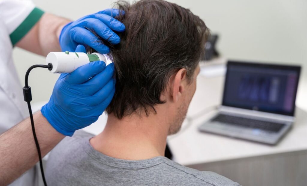 A scalp examination involves a thorough clinical assessment of the scalp and hair follicles. Using medical evaluation techniques, the dermatologist analyzes scalp condition, hair density, hair shaft quality, and underlying causes of hair problems.